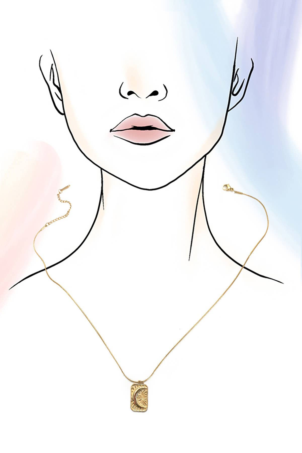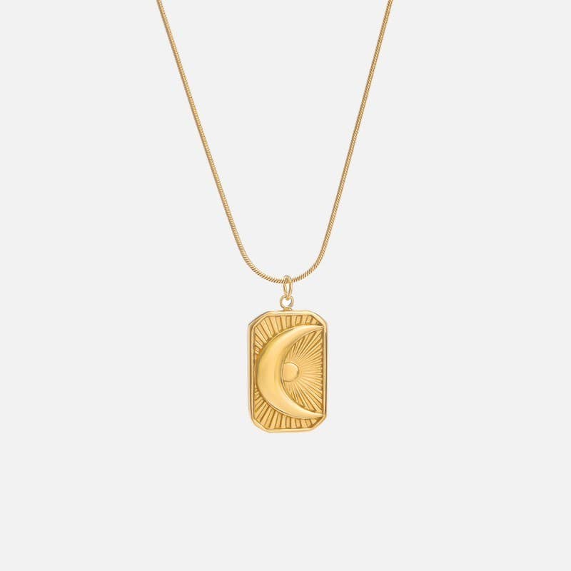 18K Stainless Steel Tarnish-Free Moon and Star Rectangle Pendant Necklace, featuring a celestial-inspired design, this elegant necklace a sleek rectangular pendant engraved with a delicate moon and star motif. Crafted from high-quality 18K stainless steel, it is tarnish-free, ensuring long-lasting brilliance and durability. Product Details: length: 16" Charm size: .75" x .5" ext: 2" ext clasp: Lobster Claw Metal finish: Stainless Steel 18K Gold product: Lead & Nickel Compliant anti-tarnish: Tarnish Free, Non-Tarnish Real Gold Dipped Necklace Stainless Steel Necklace Hypoallergenic Necklace Tarnish-Free Necklace Non-Tarnish Necklace Water Proof Necklace Water Resistant Necklace Sweatproof Jewelry Fade Resistant Necklace Anti-oxidation Lasting Shine