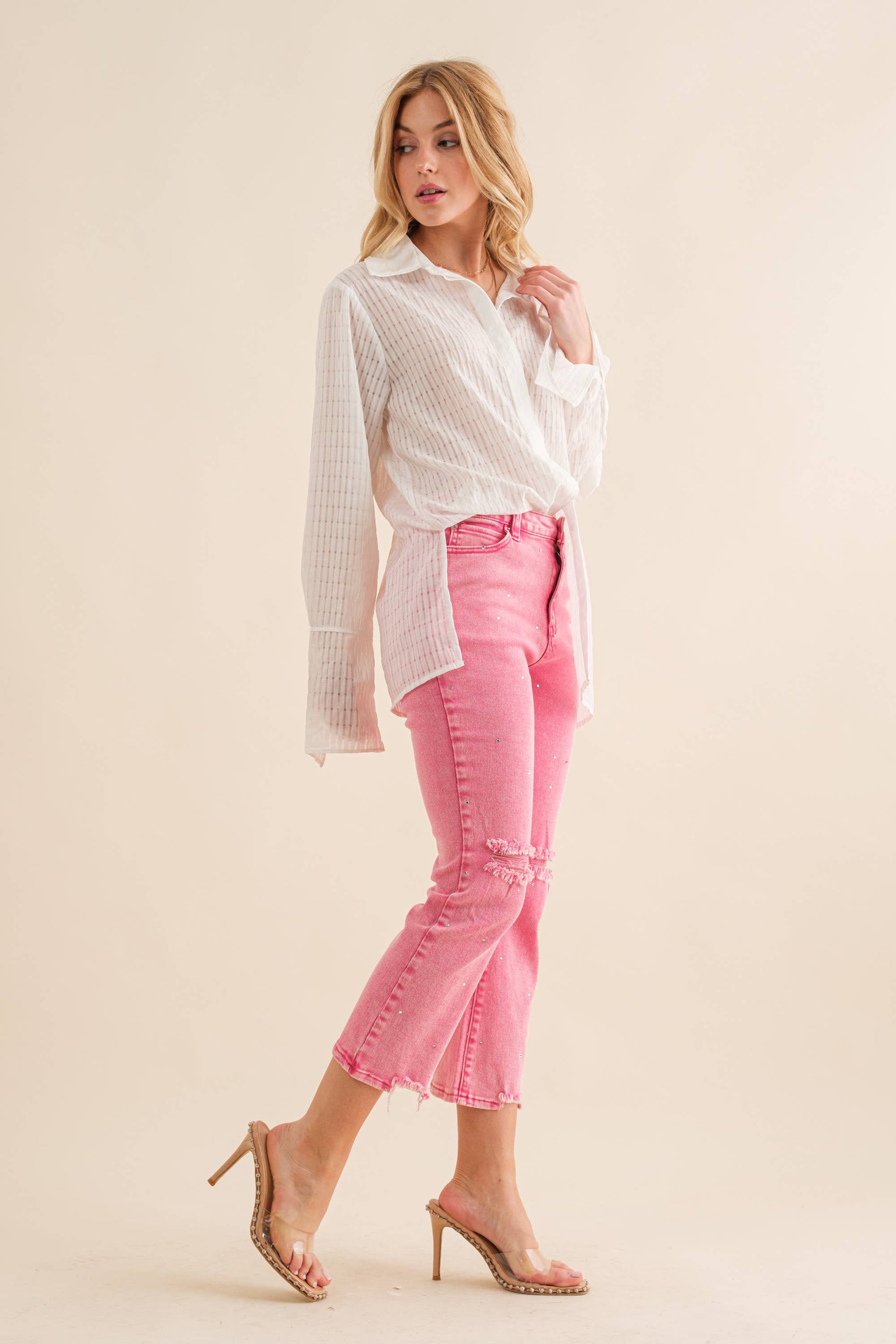 Studded Rhinestone Distressed Knee Edge Stretch High Rise Denim Jeans