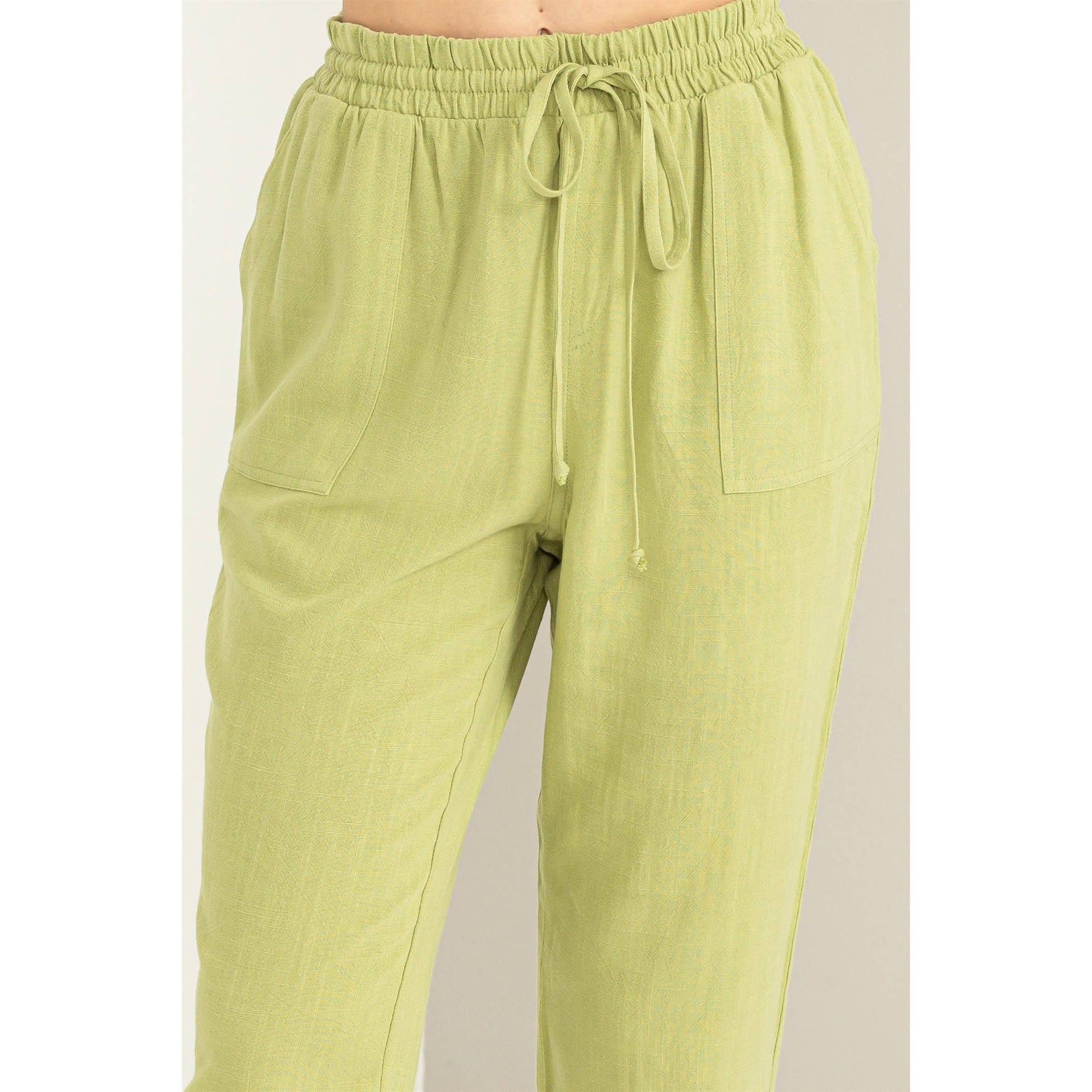 * Style No.: DZ23A546_2 Step Into A Perfectly Laid-Back Look With These Joggers! These Casually Cute Pants Come With A High-Rise Drawstring Waistband And Tapered Pant Legs With Elastic Hems. Front Side Pockets And Back Patched Pockets Complete The Look. 80% Viscose / 20% Linen Wear With/ Caffe Latte And Tropical Peach: Top Dz23a821 Dark Night: Top Dz23a825 Model Is 5' 7" Tall, 32" Chest, 24" Waist And 34" Hips And Wearing A Size Small Imported. Designed In The Usa