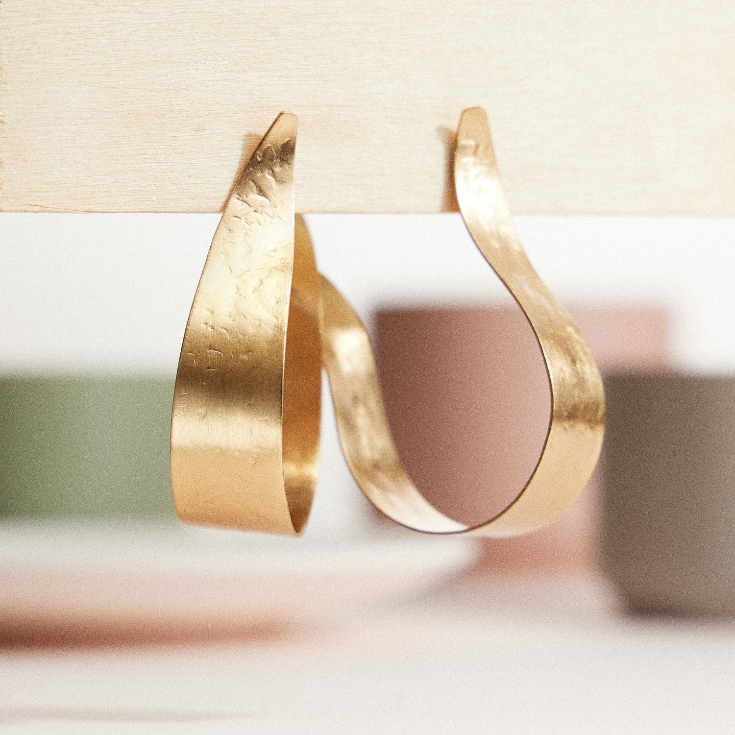 Gold-Tone Sculptural Wave Hoop Earrings – Bold & Modern Statement Earrings Make a bold statement with these gold-tone hammered teardrop earrings, featuring a unique asymmetrical shape with a textured finish. Designed for those who love eye-catching accessories, these oversized dangle earrings bring a touch of modern elegance to any look. The lightweight brass construction ensures comfortable wear, making them perfect for special occasions or adding drama to everyday outfits. Approx. 1.5 in