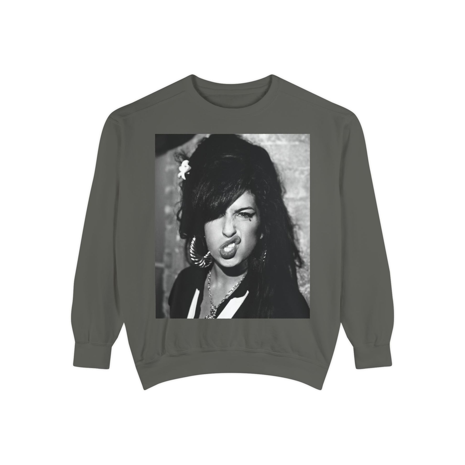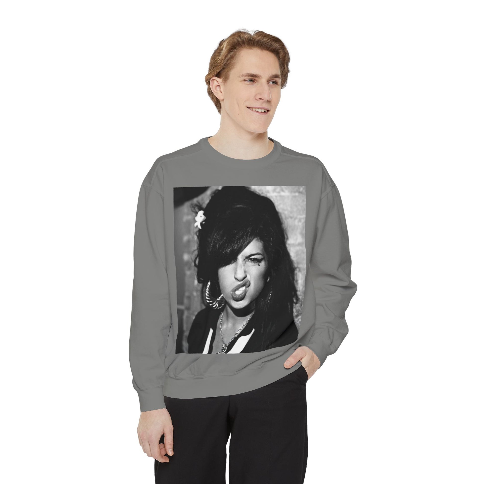 Rebel-inspired graphic sweatshirt featuring Amy Winehouse. This sweatshirt exudes a cool and edgy vibe, perfect for those who appreciate unique and bold fashion statements. Ideal for fans of Amy Winehouse or anyone who wants to stand out in the crowd. Great for casual wear or as a statement piece during music festivals or concerts.