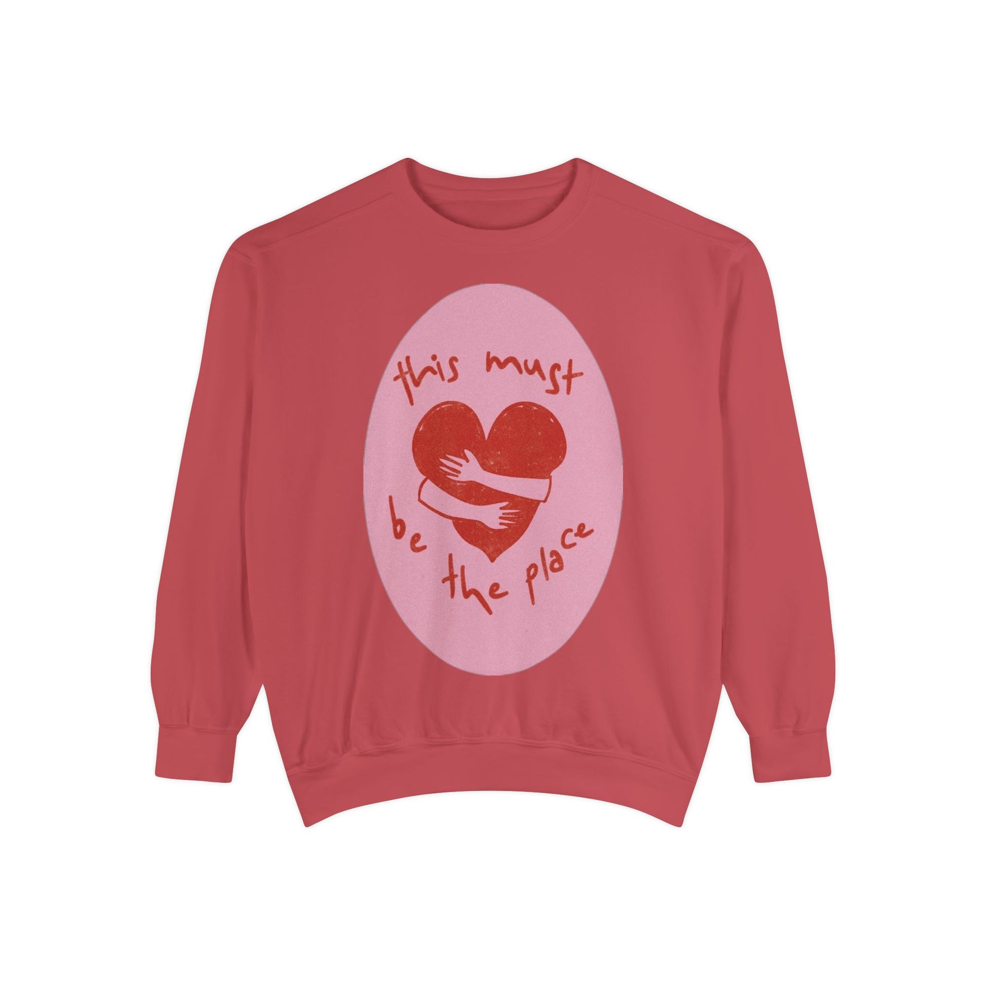 Soft, lived-in comfort with a little bit of heart. This relaxed sweatshirt wraps you in medium-weight warmth while the hand-drawn heart graphic — a slightly imperfect red heart set on a soft pink oval with the handwritten line “this must be the place” — reads like a quiet promise. The garment-dyed finish gives the fabric a gentle, broken-in feel that matches the cozy, nostalgic mood of the design.
