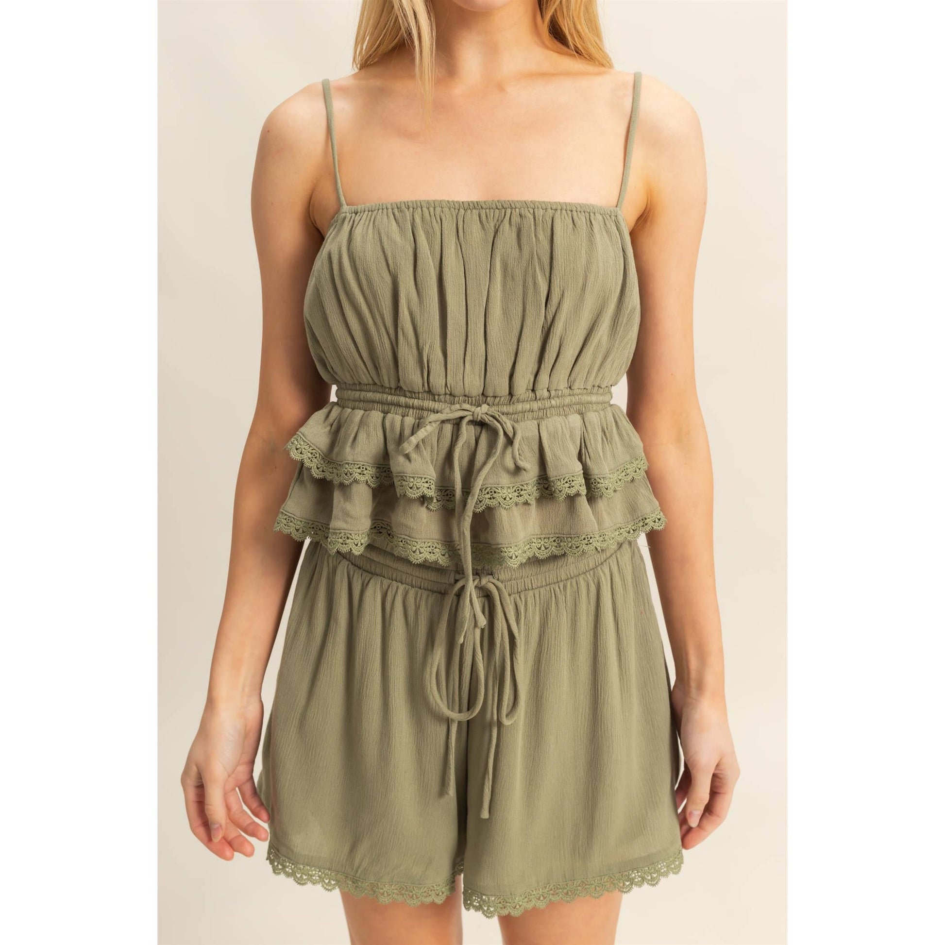 * Style No.: HF25E205-SET Fun In The Sun Starts With This Matching Set. The Top Features Dainty Shoulder Straps And A Trendy Peplum Hem, Completed With Tiered Detailing. The Matching Shorts Offer A Relaxed Fit And A High-Waist. 100% Rayon Model Is 5' 6" Tall, 32" Chest, 24" Waist, 32" Hips And Wearing A Size Small