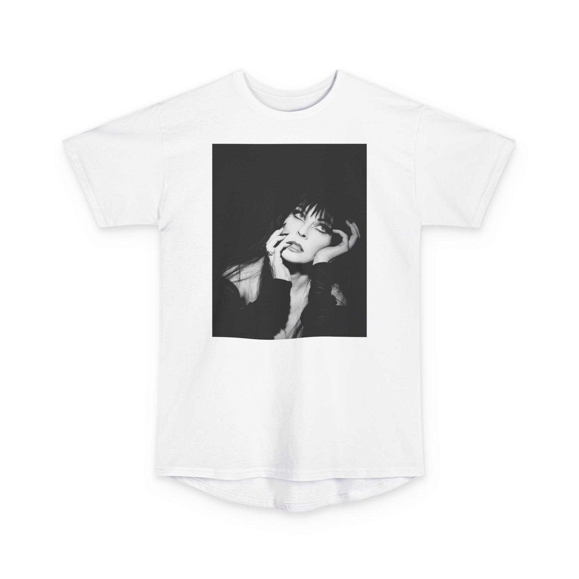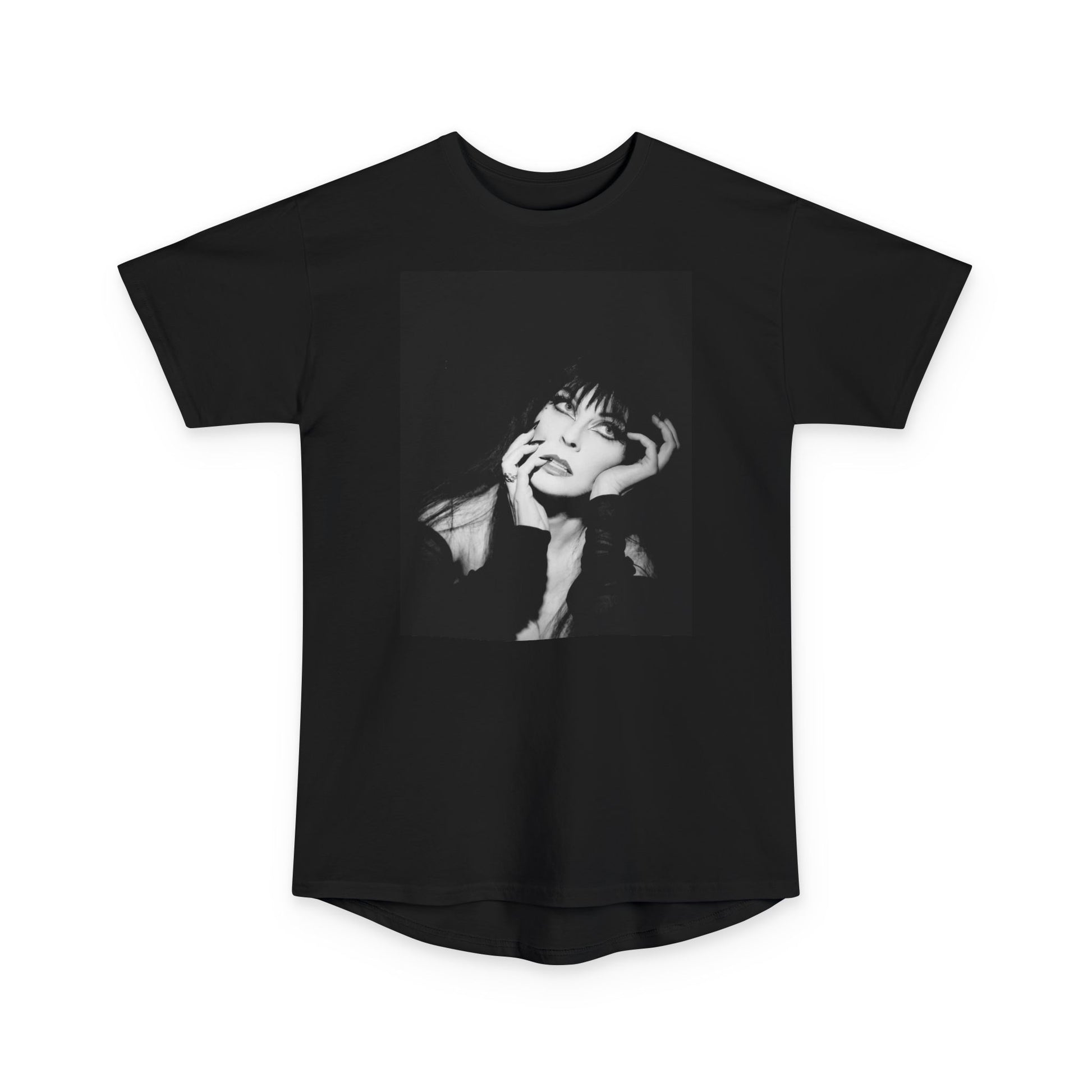 This T-Shirt features a design inspired by Elvira, mistress of the night, perfect for Halloween and lovers of all things scary and spooky. It has a dark and mysterious vibe, making it a great addition to any Halloween wardrobe. The long body and back detail add a unique touch to the classic tee, making it perfect for those who want to stand out during the spooky season.
